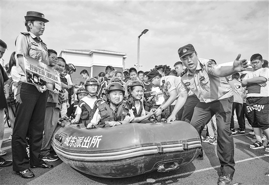 6月26日,江苏省海安市城南实验小学操场上,民警在指导小学生模拟体验使用冲锋救援艇。本报通讯员 翟慧勇 摄