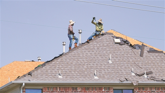 当地时间6月27日,在美国得克萨斯州达拉斯市郊,工人头顶烈日修复屋顶。