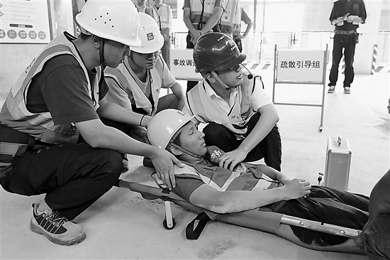 近日,中建二局深圳粤海大厦项目开展急救知识技能培训暨高温中暑应急救援演练活动,工友们对学习的防高温中暑知识进行巩固加深应急实操。演练现场,通信联络组、医疗教护组、警戒保卫组、事故调查组各司其职,反应迅速、配合默契,以最快速度确保了疑似中暑人员的安全。覃华莹 摄