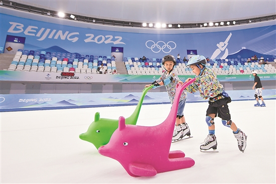 连日来,北京遭遇高温天气。国家速滑馆“冰丝带”、“冰立方”冰上运动中心、五棵松冰上运动中心等昔日冬奥健儿的竞技训练场馆,成为游客在炎炎夏日里避暑乘凉、体验冰上运动的乐园。 新华社记者 鞠焕宗 摄