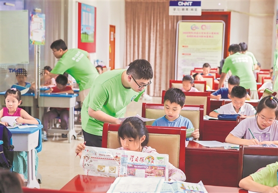 7月3日,在上海市松江区小昆山镇正泰科沁苑,志愿者对企业职工子女进行作业辅导。