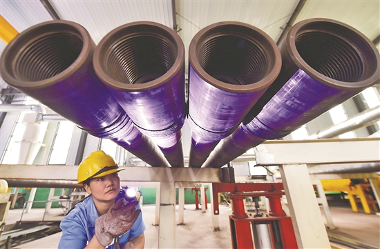 7月3日,在河北省晋州市营里镇一家地质装备生产企业,工人进行钻杆焊缝检查。