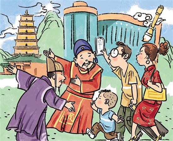 如果你爱在网上刷短视频,一定对浑身是梗的“房谋杜断”组合不陌生。近来,陕西西安大唐不夜城的表演项目“盛唐密盒”火遍全网。妙语连珠的“房玄龄”和“杜如晦”从唐朝“穿越”而来,将历史文化知识和脱口秀相结合,与游客答题互动。这种新奇有趣的沉浸式体验吸引了各地游客前来打卡,为西安这座网红城市的热度又添了一把新火。