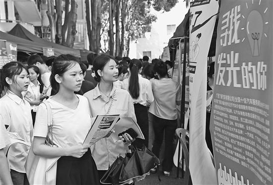 7月1日,毕业生在广西国际商务职业技术学院校园双选会上寻找合适岗位。