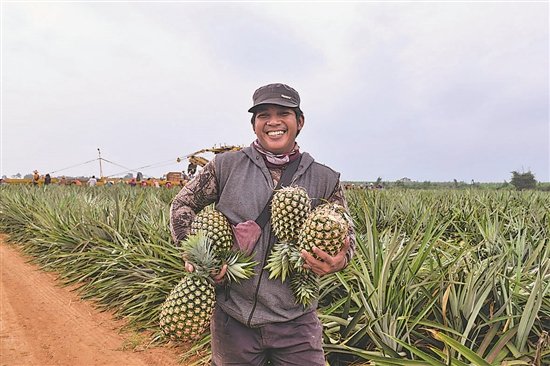 当地时间7月5日,在印度尼西亚楠榜省德邦易勿刹县一处菠萝种植园,一名采摘工人展示菠萝。印度尼西亚是世界上最大的菠萝生产国之一,苏门答腊岛又是印度尼西亚菠萝的主产地。这里的菠萝一年多收,口味香甜,菠萝鲜果和菠萝制品销往世界各地。新华社记者 徐钦 摄