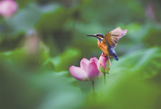 入夏以后,四川省绵阳市游仙区富乐山公园的荷花次第开放,暗香浮动的荷塘充满诗情画意。图为一只翠鸟站在荷花上。新华社发(吴吉斌 摄)