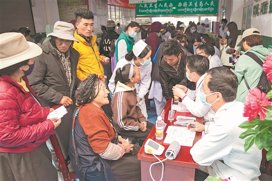 图为来自北京的医疗专家正在西藏自治区昌都市江达县人民医院为当地群众进行义诊。