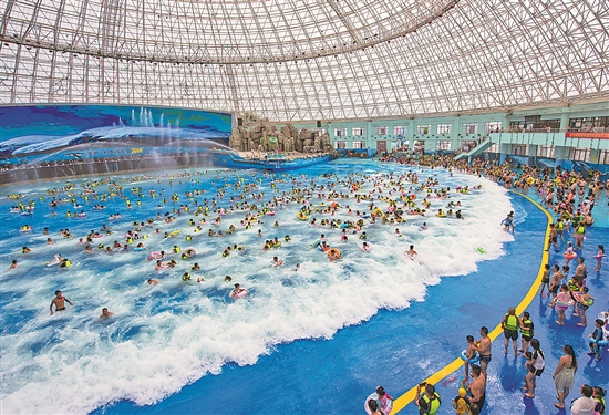 7月8日,游客在安徽省芜湖市南陵县大浦乡村世界的海啸馆戏水游玩。