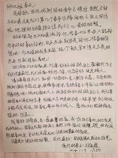“双运吾夫,当你收到信时,春节已将近,忘记这是我们第几个春节分隔两地了,不要太牵挂我们。老人无恙,我把孩子们留在东莞过年了。老妈辛苦了一年,让她好好休息。”