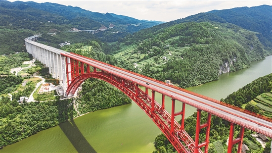 车辆行驶通过德余高速公路乌江特大桥(7月10日摄,无人机照片)。