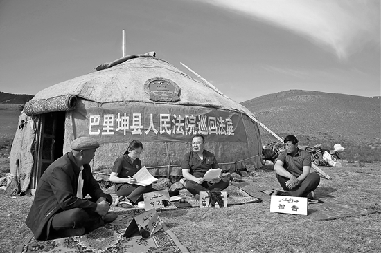 图为当日,叶里俭·阿哈提法官在下涝坝乡跑马山夏牧场开庭审理一起民事案件。