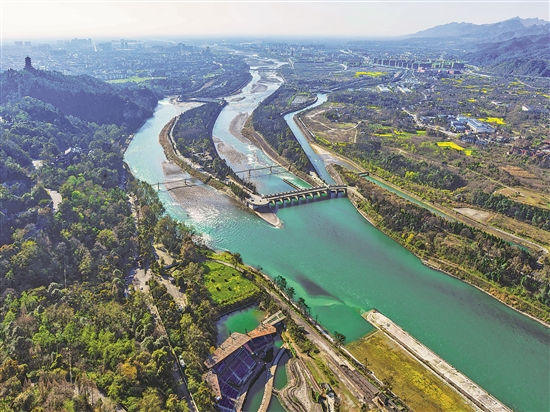 图为俯瞰都江堰水利工程,锦江起于都江堰。