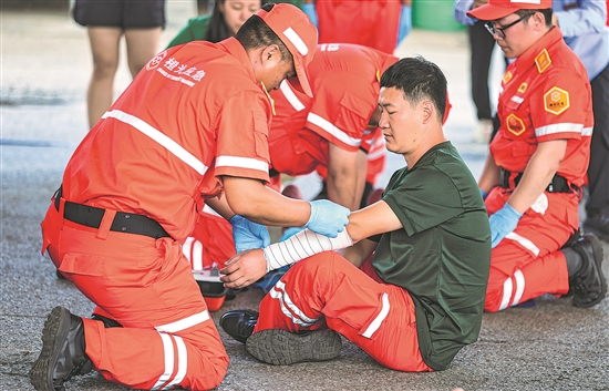 7月11日,辽宁沈阳,沈阳橙光应急救援队成立大会暨启动仪式举行,几名队员在现场演示应急救援。据了解,橙光应急救援队是沈阳环卫行业第一支、以中环洁集团内部员工为主自发组建的企业爱心救援公益团体。救援队成立后将秉承人道、志愿、专业、开放的原则,提供专业应急救助,开展公益志愿活动。视觉中国 供图