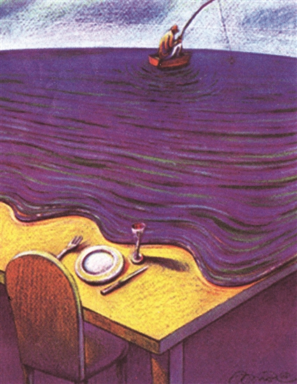 这位老兄想吃鱼了,立马驾起小舟去湖中垂钓,一番辛劳过后则美食入盘——“淡泊之中滋味长”。享受劳动果实,其乐无穷。