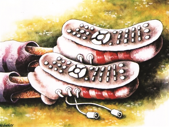 揭露足球比赛做假、弄“鬼”的漫画甚多,这幅画作者却从人为操作绿茵场的角度入手将战靴比喻成遥控器——入木三分!