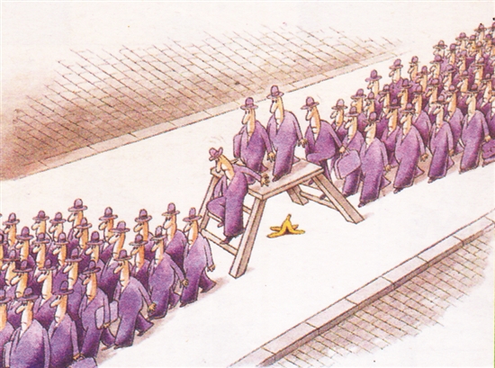 有人扔了块香蕉皮,平时遇到热心肠的小朋友拾起丢进垃圾桶即可,今日偏偏都是自诩“文明”的过路人,竟然搭起过街桥……
