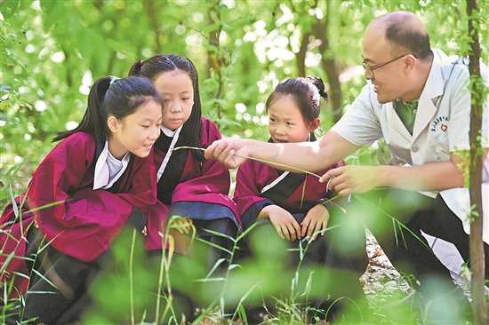 7月15日,参加中医药文化主题夏令营的小学生在野外了解中药芦根。暑假期间,河北省沧州市盐山县卫健局为小学生举办中医药文化主题夏令营,让孩子们体验中医药传统文化特色,深入了解中医药。