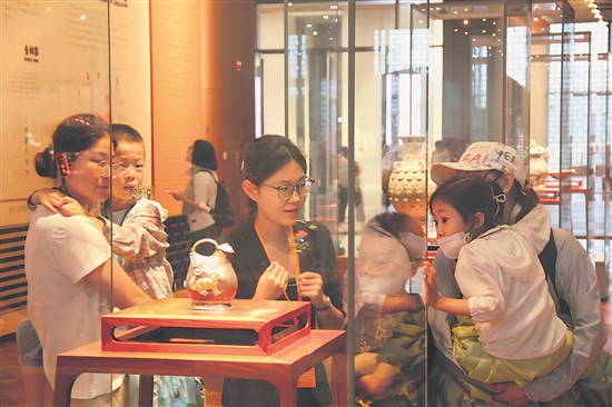 暑假期间,北京各类文旅场馆成为人们避暑休闲的好去处。一位来自海南的家长表示,带领孩子参观工艺美术馆,不仅有助于缓解孩子繁重的学业压力,而且还让孩子了解中国工艺美术,感受中华美学。图为7月13日,中国工艺美术馆内,家长和孩子在讲解员的引导下欣赏工艺美术作品。
