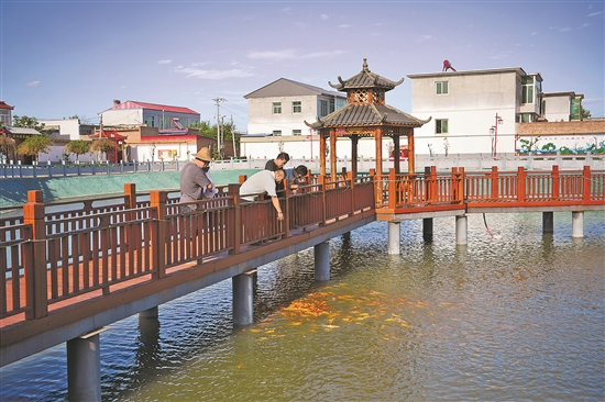 7月16日,村民在河北省涿州市高官庄镇上庄村由垃圾坑塘经过治理建成的游园内喂鱼。