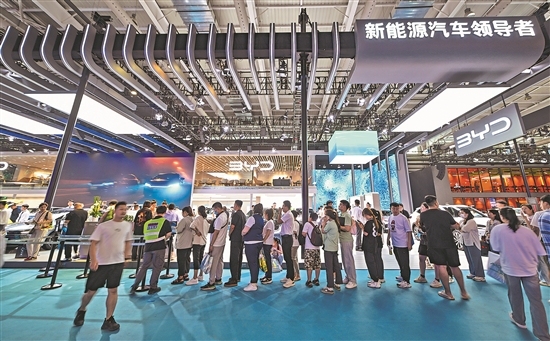 7月17日,观众在长春汽博会比亚迪品牌汽车展区前排队等待入场。