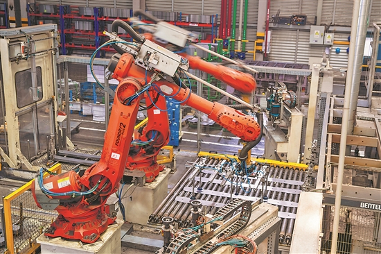 7月16日,在位于重庆市两江新区的重庆至信实业集团有限公司,机械手臂在热压车间内作业。