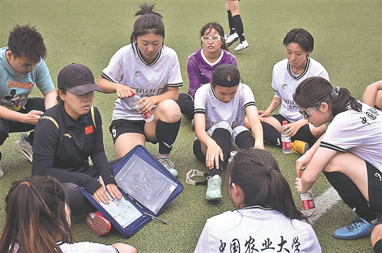 屈珊珊(戴黑帽者)在比赛中指导农大女足队员。受访者供图