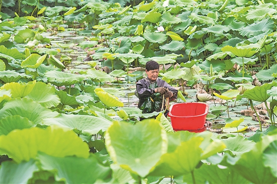 7月19日,在南县华阁镇光复渔村,村民在采收藕根。