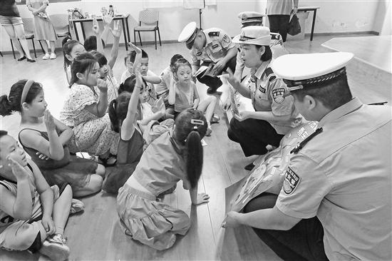 7月17日,山西运城,几名民辅警走进新绛县一家艺术教育培训中心,为放暑假的小朋友讲解交通安全常识。“三伏”天里,新绛县公安局交警大队组织民辅警持续开展主题“清凉一夏”保平安暑期交通安全宣传,提醒人们遵守交通法规,平平安安“清凉一夏”。