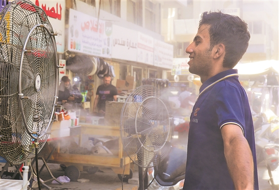 当地时间7月18日,在伊拉克巴格达,一名男子在街头吹电扇降温。近日,伊拉克遭遇高温天气,部分地区最高气温接近50摄氏度。 新华社发 (哈利勒·达伍德 摄)