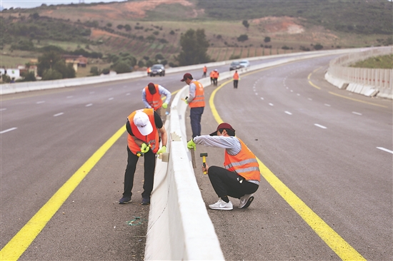 阿尔及利亚东西高速公路东标段临近突尼斯边境的最后84公里路段项目(以下称“84公里项目”),由中国中信建设有限责任公司承建。由于地形和地质条件复杂,“84公里项目”是出了名的难度高、成本高。“中信建设的筑路人没有退缩,在他们顽强拼搏下,没有什么是不可能的。”阿地质专家艾特·马哈茂德说。图为在阿尔及利亚塔夫省,施工人员为阿尔及利亚东西高速公路84公里项目通车做准备。新华社发