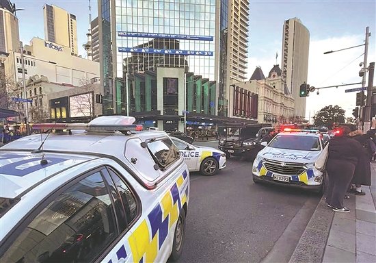 当地时间7月20日,在新西兰奥克兰,警方封锁枪击事件现场附近道路。