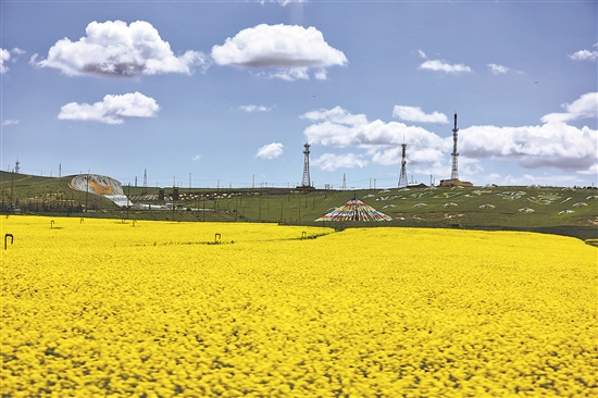 7月19日,青海省海北藏族自治州油菜花绽放。繁花与远山、村落交相辉映,恰如一幅浑然天成的油画,吸引各地游客纷至沓来。本报记者 刘金梦 摄