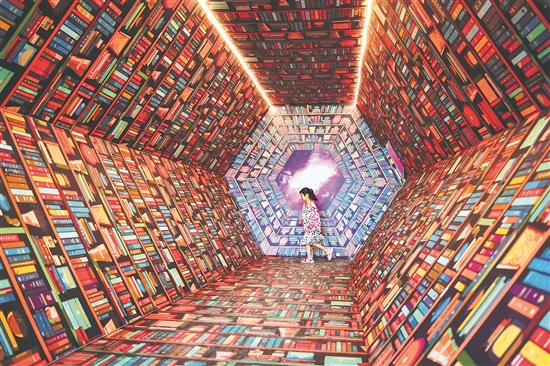 “迷宫”内藏书4万余册,采用了当下最受欢迎的互动式体验模式,将阅、看、玩、乐、游有效融合。走入迷宫,色彩斑斓的书墙如万花筒般,让读者朋友瞬间如时空穿梭,走入阅读的奇境。