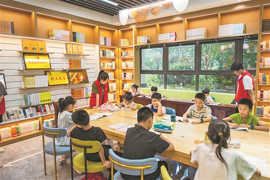 7月24日,在安徽省芜湖市繁昌区峨山镇金峨社区的职工书屋内,大学生志愿者正给暑托班的孩子进行作业辅导。暑假期间,金峨社区为缓解辖区内上班族带娃难问题,依托职工书屋开设公益暑托班,丰富孩子们的暑期生活。