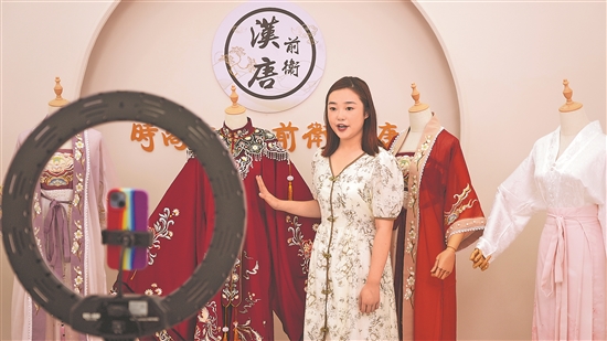 7月25日,在山东曹县一家生产汉服的公司内,主播正在向网友推介汉服产品。