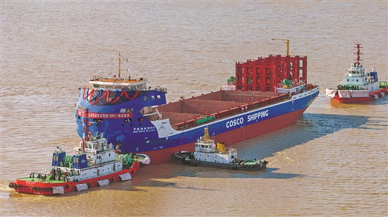 7月26日,江苏扬州,扬州中远海运重工有限公司建造的700标箱纯电池动力集装箱船N997轮正式出坞。该船总长119.8米,型宽23.6米,其装船电池容量全球最大,也是国内在建最大吨位的电动船项目和首批绿色零碳试点船型,由我国自主设计研发建造,拥有自主知识产权。