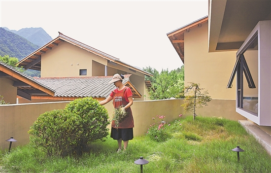7月24日,陕西省汉中市留坝县玉皇庙镇秦岭1号民宿内的房间管家在清理院内杂草。