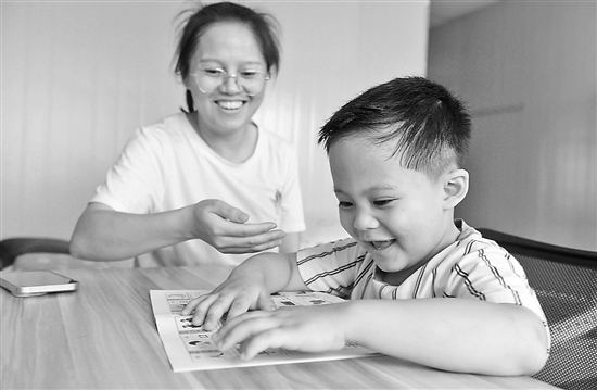 7月26日,在广西上横高速公路建设工地职工宿舍活动板房里,来自广西来宾市的韦靖楷在妈妈的指导下看图识字。