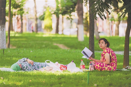 近日,乌兹别克斯坦塔什干州、撒马尔罕州和布哈拉州等多地将迎来40摄氏度以上的高温天气。图为人们在乌兹别克斯坦首都塔什干一处草地避暑消夏。