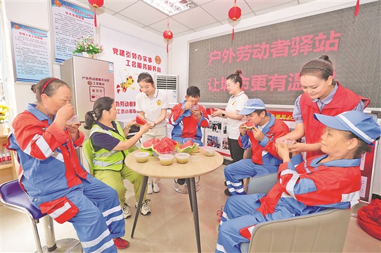 7月28日,在安徽省安庆市迎江区人民路街道先锋社区户外劳动者工会驿站,“工会小蜜蜂”为环卫工人送去西瓜、绿豆汤等防暑降温物资。