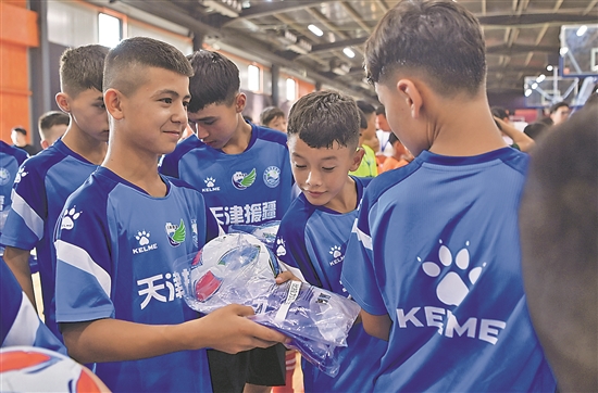 7月27日,来自新疆和田的小球员展示自己刚领取的足球和队服。当日,“石榴籽一家亲”新疆和田足球小巴郎(小男孩)进津交往交流交融活动暨系列足球友谊赛启动仪式在天津正道体育公园举行。此次活动持续至8月3日,约60名来自新疆和田的青少年还将参观周邓纪念馆、南开中学、津门虎足球俱乐部等地。 新华社记者 李然 摄