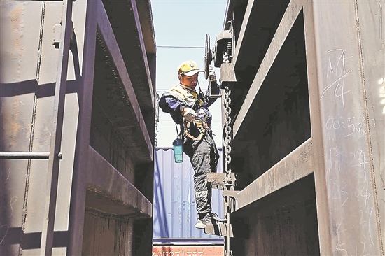 退役军人钱程是中铁呼和浩特局集团公司乌海车务段的一名调车员,工作中他需要长时间扒乘在车梯上,热浪打在他脸上,汗水流个不停。每次作业,他都会带上两个水壶,一个用来喝水,另一个专门给身上洒水降温。“夏天是我们一年中作业量最大的时候,可相比于当兵时的强行军训练来说,还是可以轻松拿捏。”他打趣道。