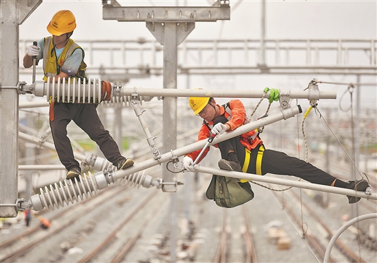 7月31日,在昌景黄高铁南昌东区段,中国铁路南昌局南昌供电段“昌景黄”验收组的工作人员正在对接触网供电线路进行静态验收。目前,静态验收已进入尾声,标志着昌景黄高铁即将进入接触网送电阶段。