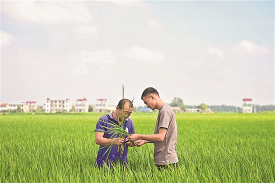 8月1日,在安徽省蚌埠市五河县浍南镇杨集村,吴家欢和父亲交流水稻的生长情况。