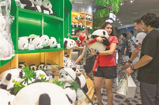 图为在大熊猫纪念品商店,一名女运动员高兴地抱起了一个大熊猫玩偶。本报记者 蔚可任 摄
