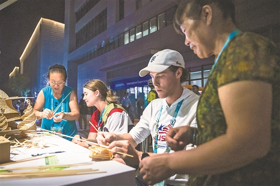 在大运村文化集市,两名国外运动员在老师带领下编织草帽。本报记者 蔚可任 摄
