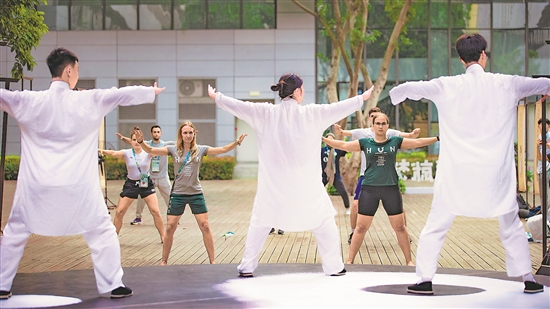 图为大运村的太极拳体验现场,国外运动员对此项体验活动十分追捧。本报记者 蔚可任 摄
