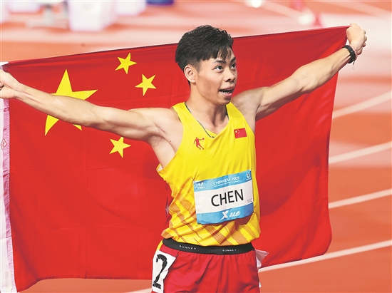 8月2日,成都大运会男子百米飞人大战,中国选手陈冠锋以10秒17的成绩收获铜牌。本报记者 蔚可任 摄