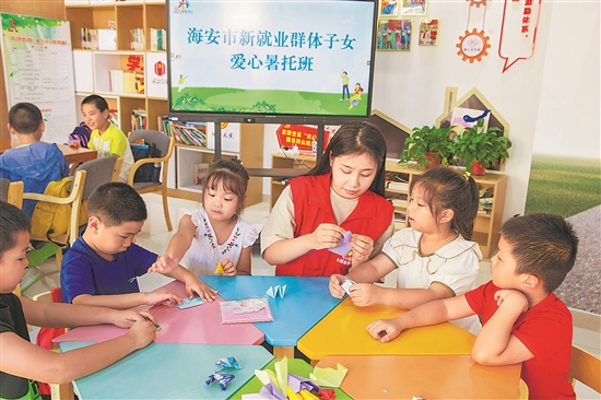 8月1日,在江苏省海安市海安街道新园社区外卖送餐员党群服务中心举办的“爱心暑托班”上,志愿者在指导孩子们体验折纸艺术。据悉,该暑托班针对的是当地新就业形态劳动者的子女,为期4周,提供“暑假托管+课堂教育+研学实践”等公益服务。本报通讯员 翟慧勇 摄