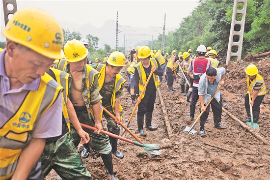 京津冀地区持续强降雨,导致北京丰台至沙城铁路(丰沙线)受到严重损毁。水害发生后,铁路部门出动人员1880人,组成两支队伍连夜抢修,并成功抢通丰沙线上行沙城至旧庄窝间线路。8月2日,滞留丰沙线内的旅客均安全抵达北京丰台站。本报记者 王伟伟 摄